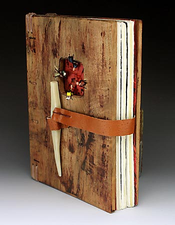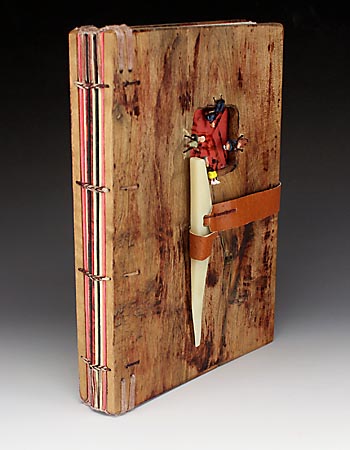 8 1/4 x 6 x 1 15/16 144 pages maple scraps glued together and milled to the boards leather and elk bone closure, h/o scale train characters Mohawk and marbled paper mica waxed linen thread $125